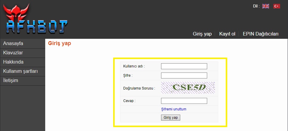 http://www.afkbot.com/Main/Index adresine gidin ve ardından "Giriş yap" sekmesine tıklayınız.