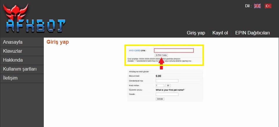 Satın almış olduğunu kodu istenilen yere eksiksiz ve dikkatli bir şekilde girerek "E-PIN'i Yükle" butonuna tıklayınız.